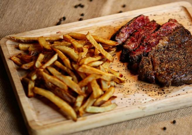 For your main, there’s a juicy ribeye steak served with chips and fresh salad, keeping things indulgent.